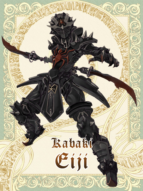 俺の防具にもある、西洋甲冑の「黒蜘蛛之鎧(くろぐものよろい)」をイメージして描いてもらった。